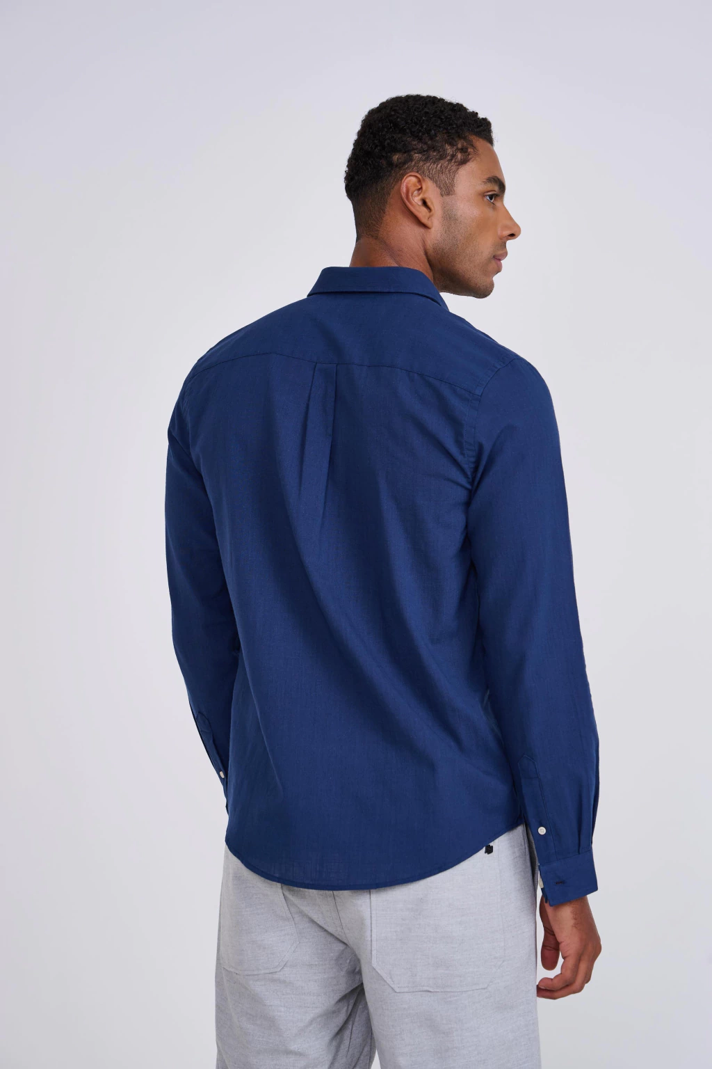 Detalhes: Cor sólida azul marinho com uma textura sutil do linho, logo Colcci bordado discretamente no peito, botões claros que criam um contraste elegante.