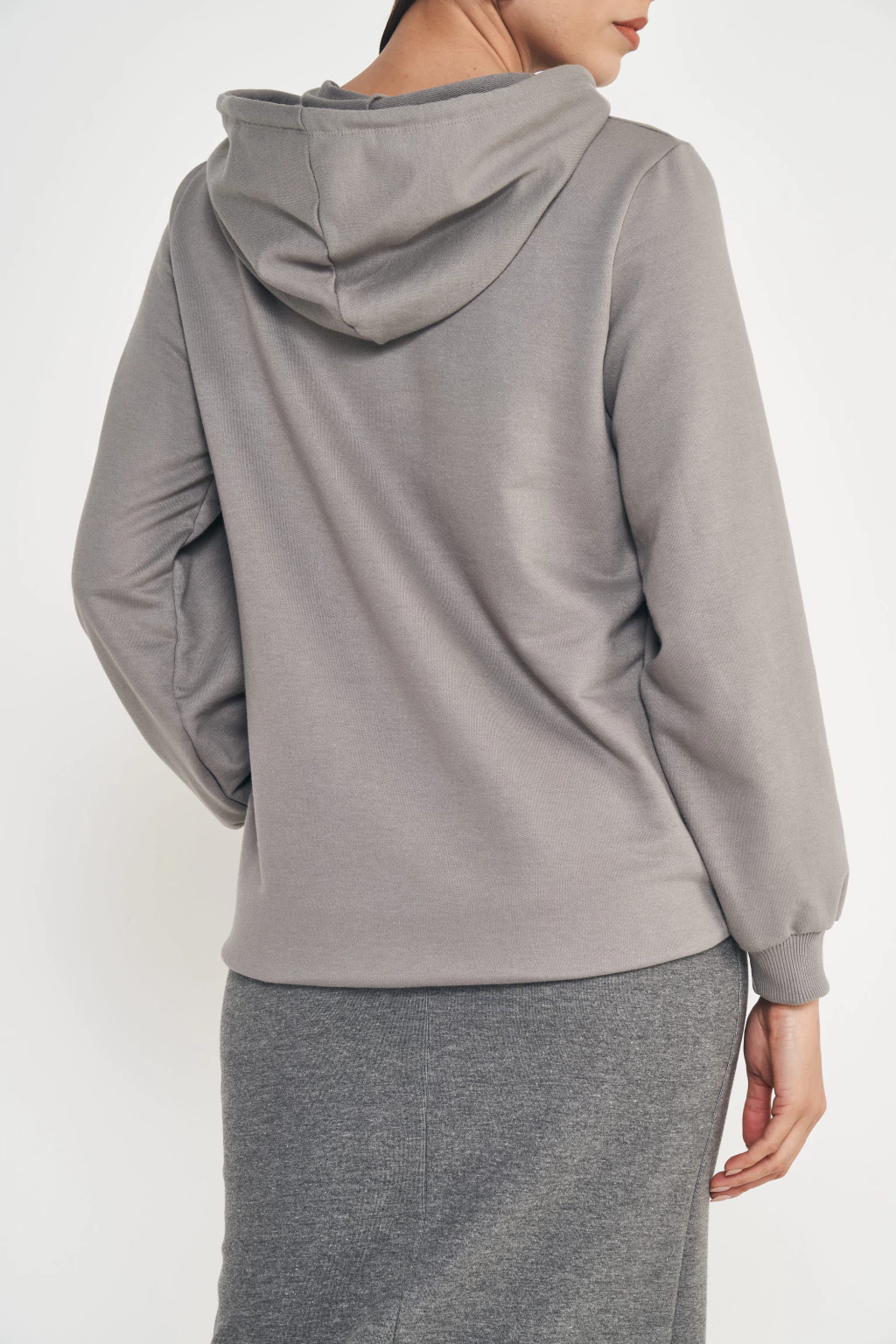 Jaqueta: Modelagem oversized, manga longa, capuz com cordões, fechamento frontal com zíper, bolsos canguru, cor cinza.