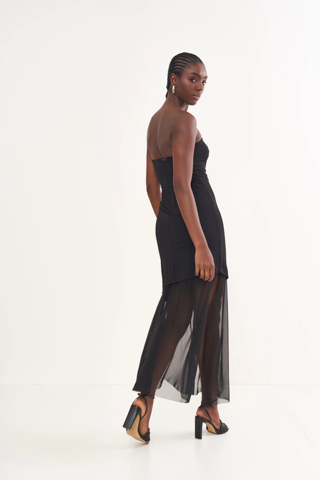 Design: Modelagem tomara que caia (strapless) com corpo justo estilo tubinho. A saia possui uma sobreposição assimétrica de tule transparente, criando um comprimento midi fluido e moderno.